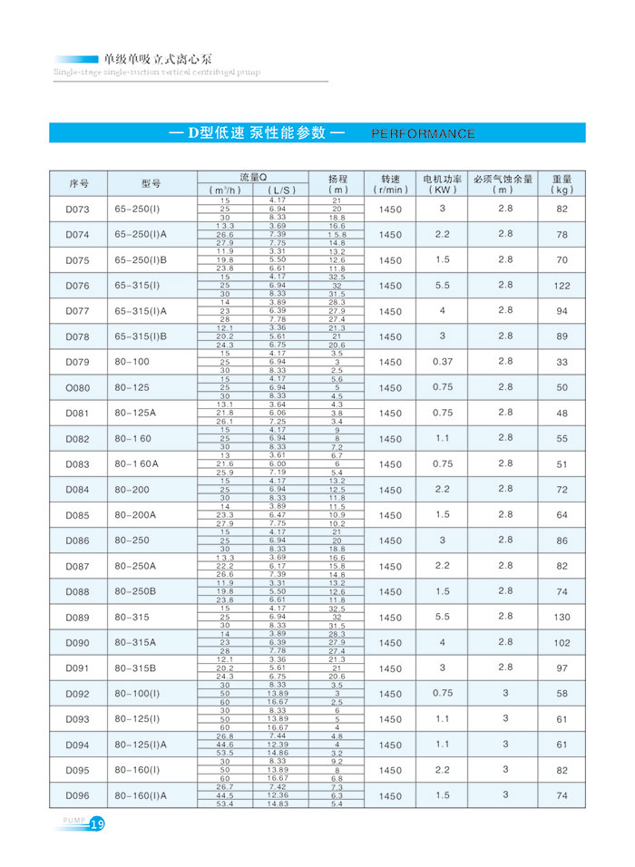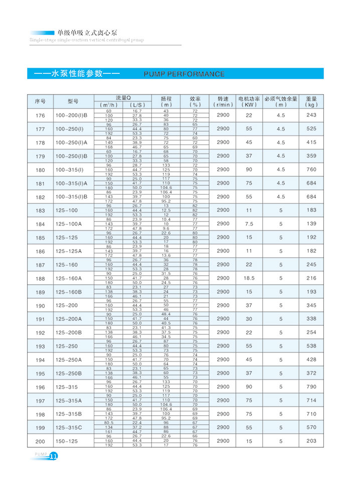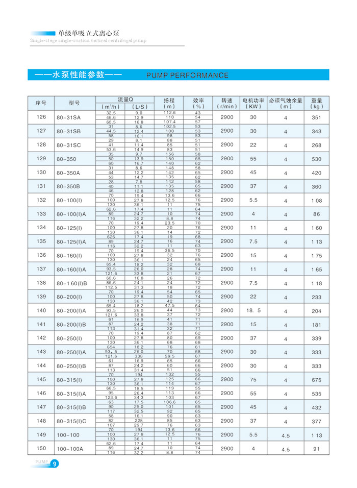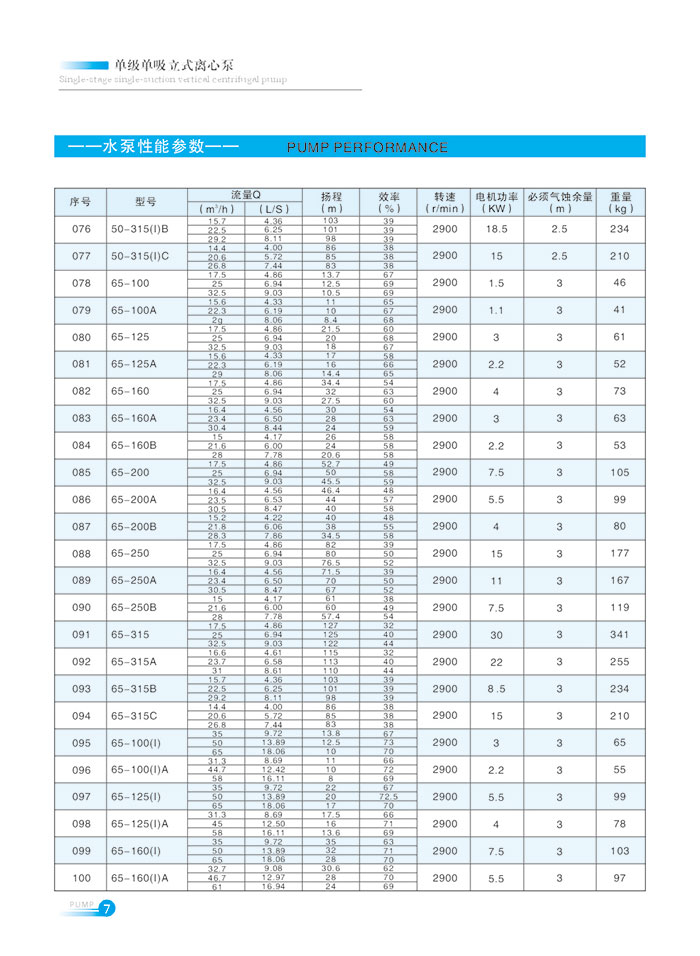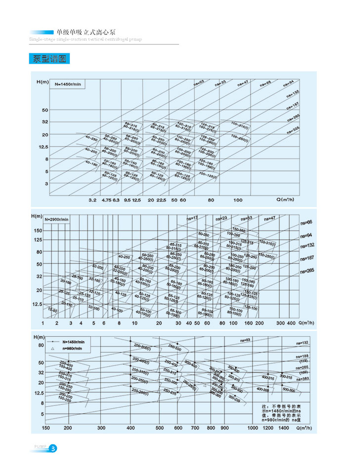 流量範圍1.5~1200m7h,揚程範圍8-150m,分(fèn)基(jī)本型、擴流型,A,B,C切割型等250多種規格。根據流量介質和溫(wēn)度不同,設計製造成同性能參數的熱水(shuǐ)泵、化工泵、油泵和防爆化工泵係列產品。