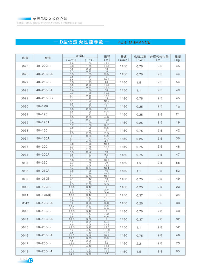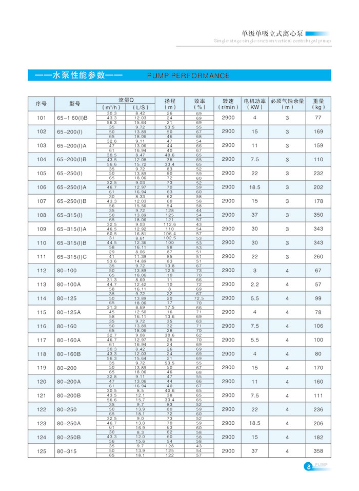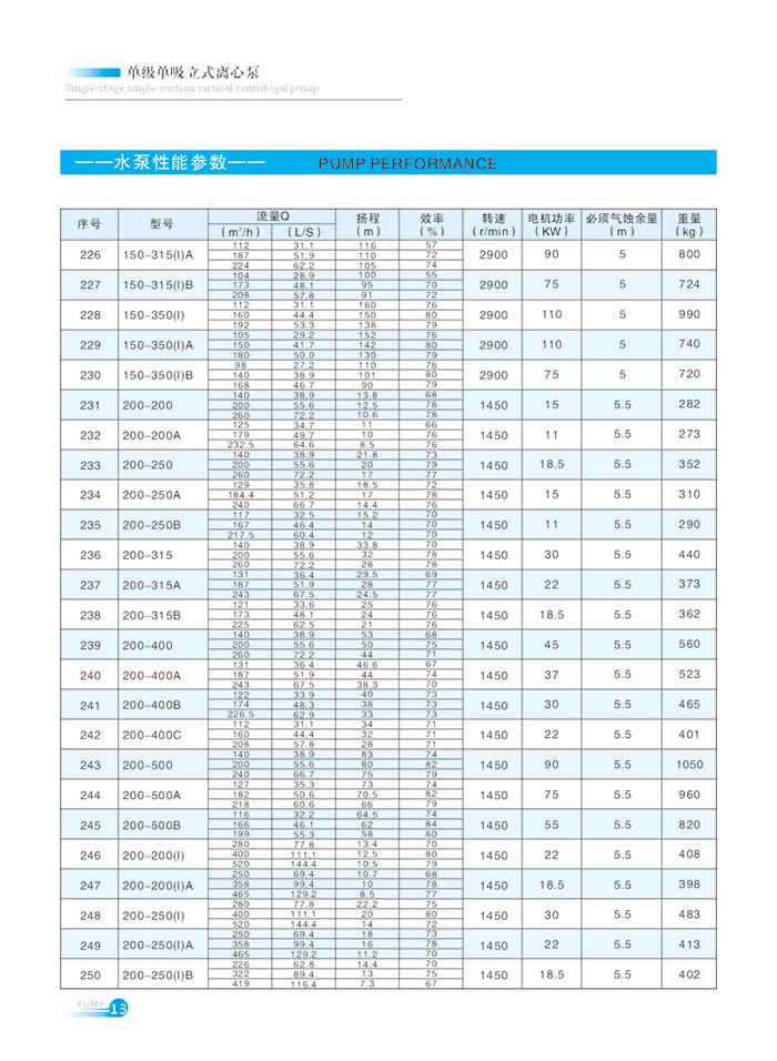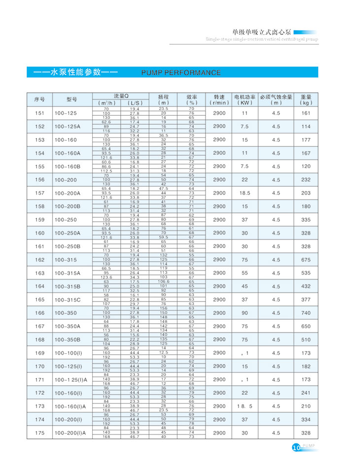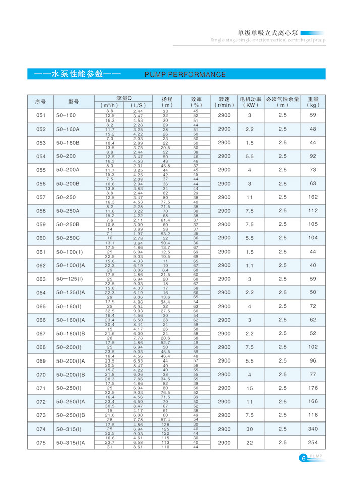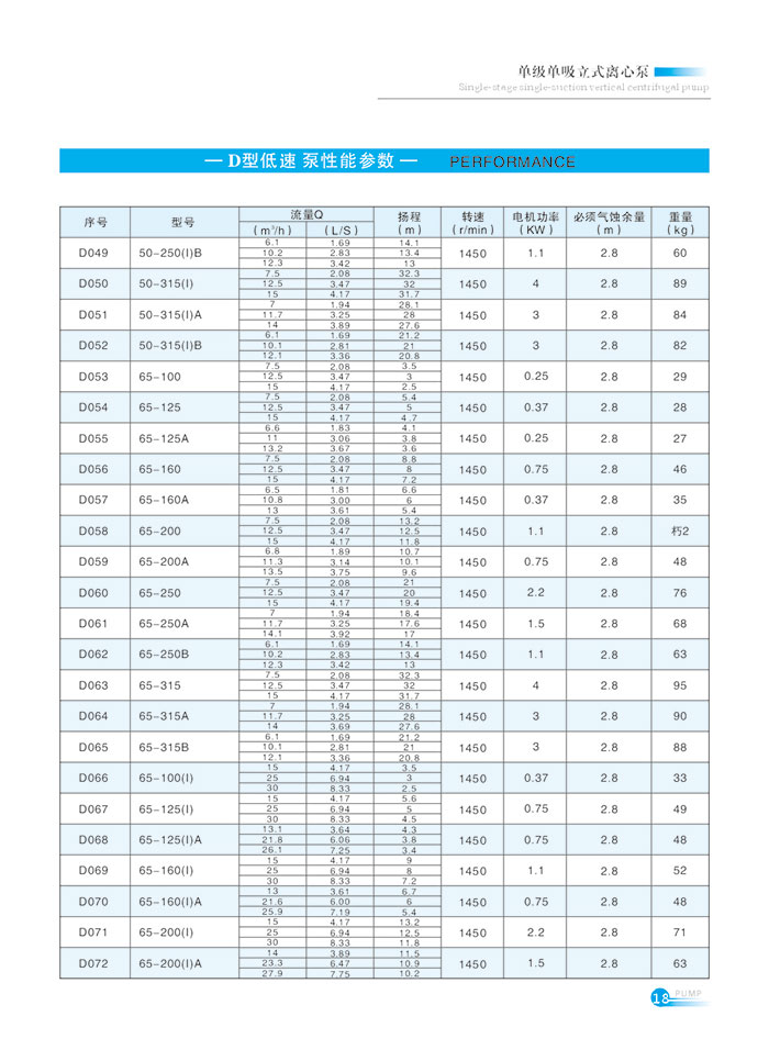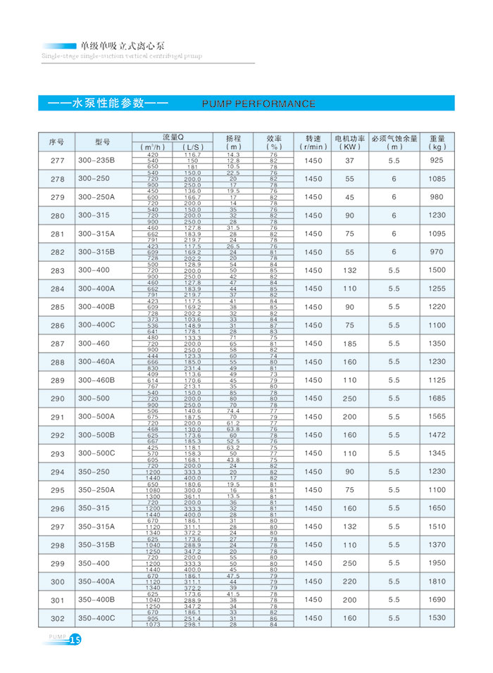 流量範圍1.5~1200m7h,揚(yáng)程範圍8-150m,分基本型、擴流型(xíng),A,B,C切割型等250多種規格。根據流量介質和溫度不同,設計製造(zào)成同性能參數的熱水泵、化工泵、油泵和防爆化工泵係列(liè)產品。
