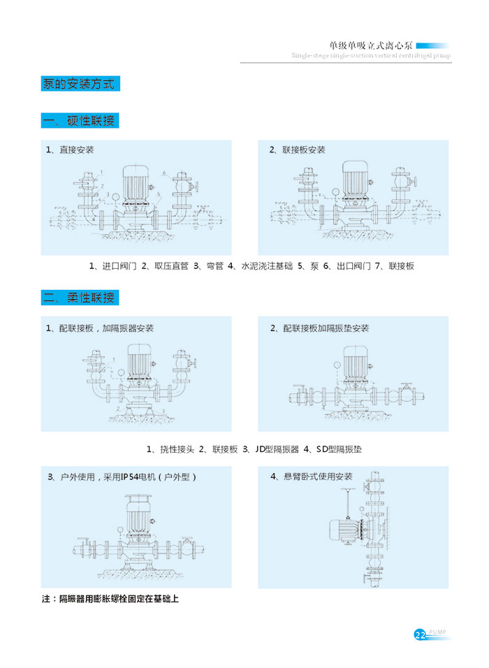 2、安裝時須擰緊地腳蝮柱且每隔一定時段應對其進行檢查,防止其鬆動,以免水泵起動時發(fā)生振動而影(yǐng)響泵的性能: