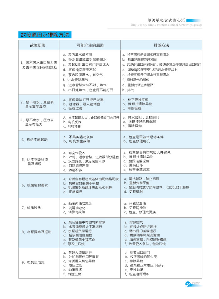 5、泵用於有吸(xī)程場合,應裝(zhuāng)有底閥•且入口營不應有(yǒu)過多彎(wān)頭,同時不得有漏水、漏氣現象以免影響水(shuǐ)泵的吸入性能;為不使雜質進入泵內(nèi)而堵塞流道應在泵入口前安裝過濾(lǜ)器。