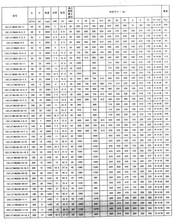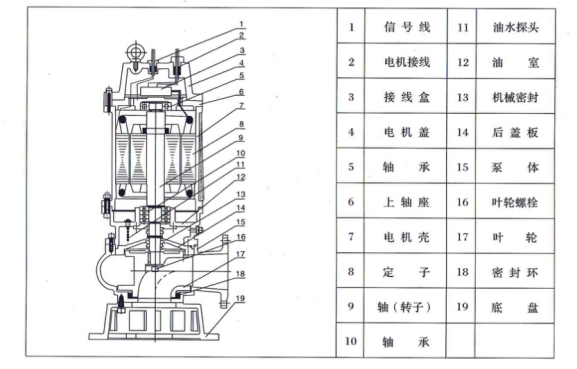 WQ型無堵塞潛水排汙泵由電機與泵兩部分組成,二者通過油隔(gé)離室及機械(xiè)密封組(zǔ)件隔開,屬機電-體化產品(pǐn)。電機與泵合用同軸(轉子)整(zhěng)個(gè)水泵長度短,結構緊湊。配備多種保護(hù)裝置(zhì),使得泵運行可靠。其主要部件作用如下: